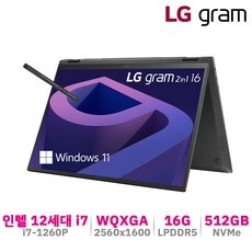 LG전자 LG그램 16인치 2인텔 12세대 초경량 360 터치펜 노트북 16GB 512GB, 16T90Q-K.AAC7U1, WIN11 Home, 코어 i7, 블랙